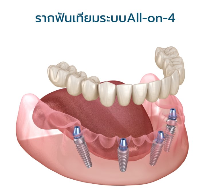 ระบบรากฟันเทียม All-On-4 เป็นการทดแทนฟันทั้งขากรรไกรโดยใช้รากเทียม 4-6 ราก บริเวณกระดูกขากรรไกรด้านหน้าซึ่งมักจะมีมากกว่าด้านหลัง ทันตแพทย์จะใช้สกรูเพื่อยึดฟันปลอมเข้ากับแกนหลักยึดบนรากฟันเทียม ไม่ให้กระดก หรือ โยกไปมาได้เหมือนฟันปลอมทั่วๆไป ไม่จำเป็นต้องถอดออกมาทำความสะอาดเหมือนฟันปลอมปกติ