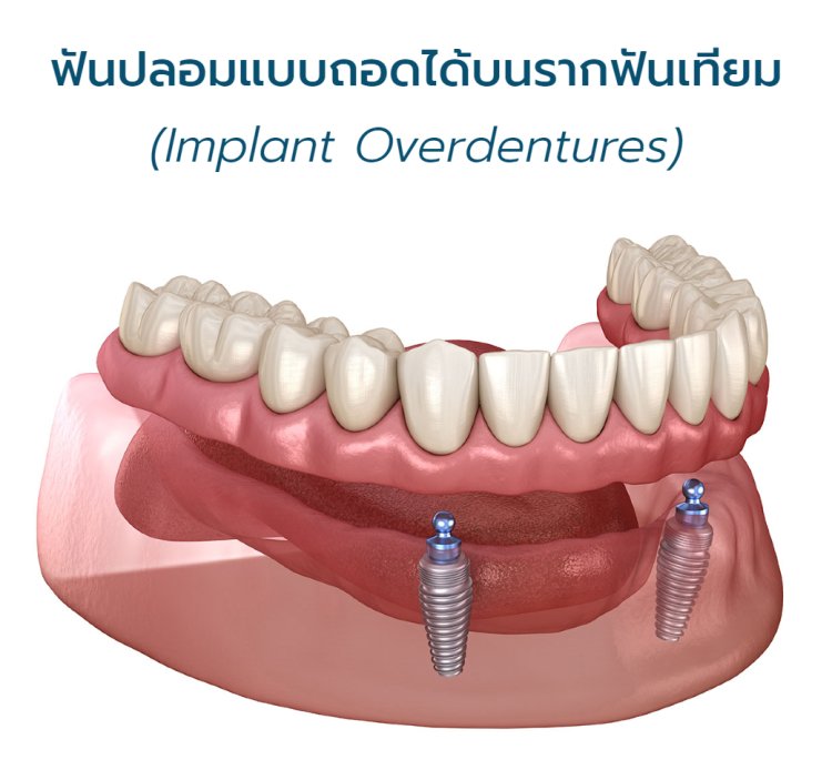 รากฟันเทียมรองรับฟันปลอม การรักษานี้ช่วยให้ฟันปลอมที่ใส่มีที่ยึด ไม่ขยับไปมาและทำให้ฟันปลอมแน่นขึ้น จำนวนรากฟันเทียมที่ฝังทันตแพทย์เฉพาะทางรากฟันเทียมจะเป็นผู้ประเมินจำนวนรากฟันเทียมที่จำเป็นต้องใช้จากสภาพกระดูกโดยมีจะความแตกต่างกันไปในแต่ละบุคคล